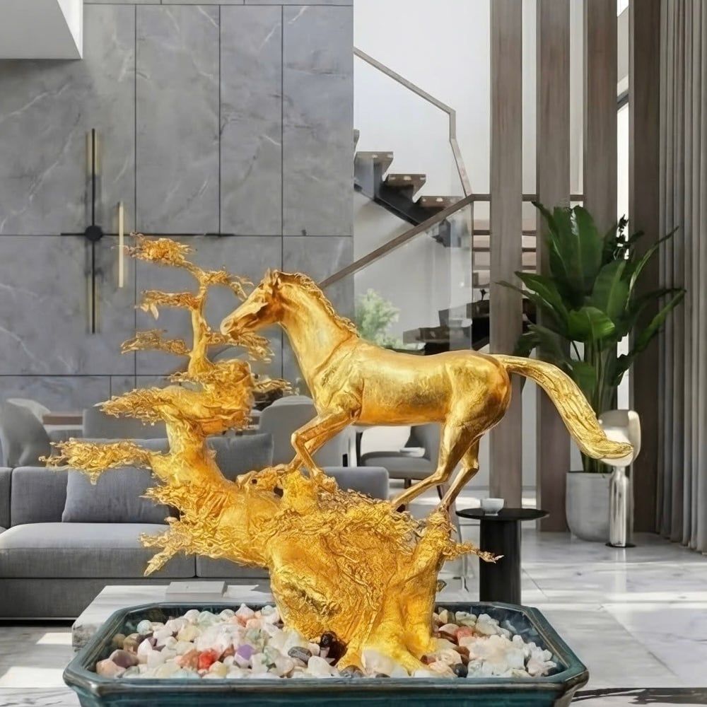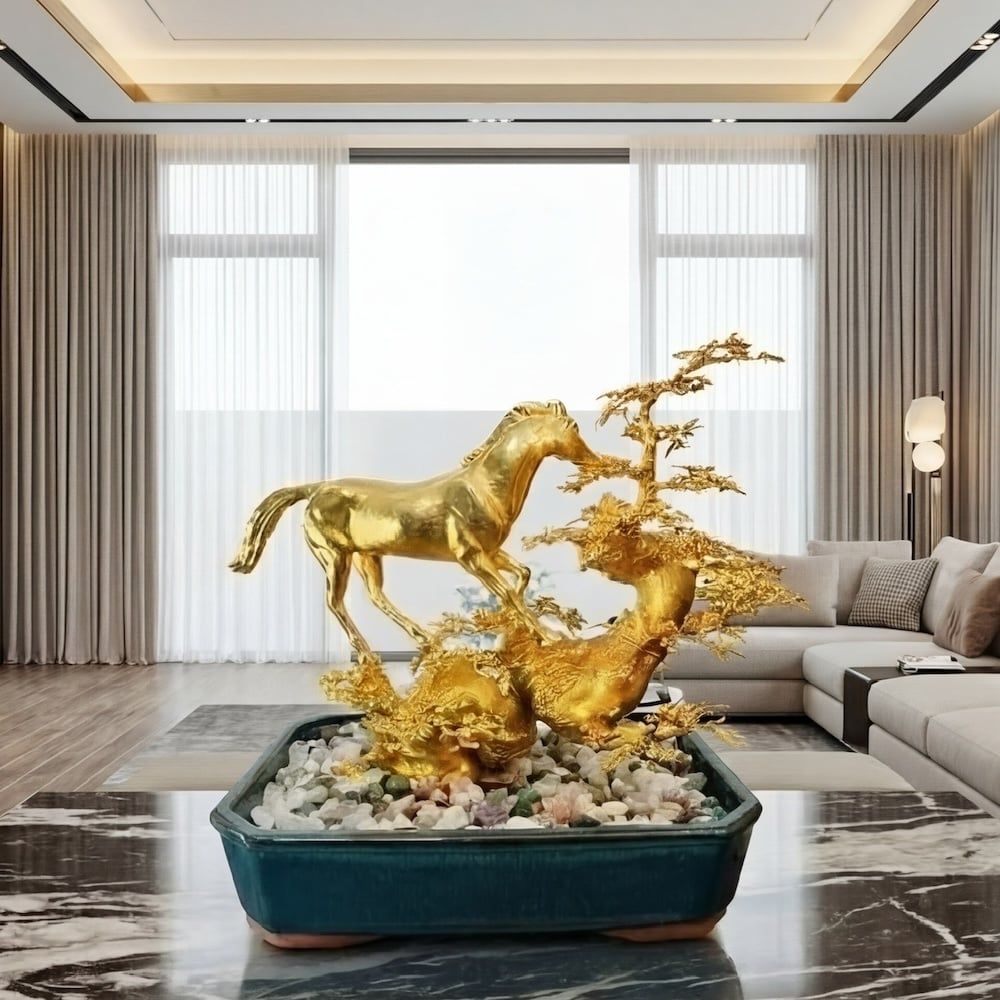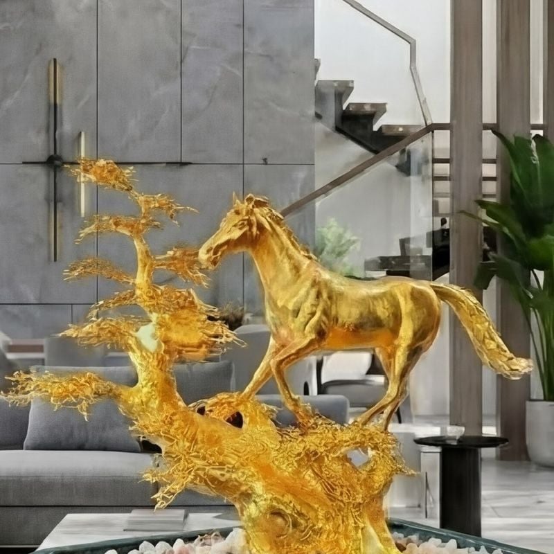 Ngựa là linh vật đại diện cho sự tốc độ, bền bỉ, tinh thần tiến lên và khả năng chinh phục mục tiêu. Khi được kết hợp cùng hình tượng Cây Mai Ngũ Phúc – biểu tượng cho 5 điều ước tốt đẹp nhất trong cuộc sống con người, gồm: Phúc, Lộc, Thọ, Khang, Ninh. Tác phẩm Ngựa Vàng Ngũ Phúc không chỉ đơn thuần là tác phẩm trang trí mà còn là biểu tượng phong thuỷ ý nghĩa, xứng đáng đặt ở những không gian sang trọng, đẳng cấp.