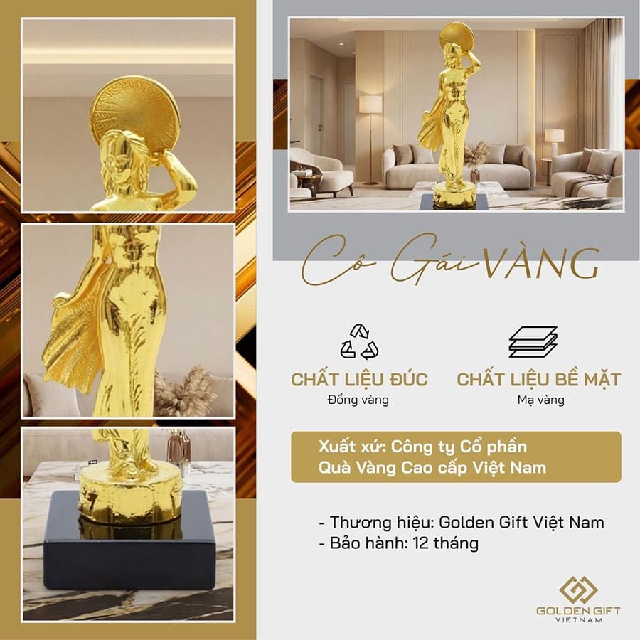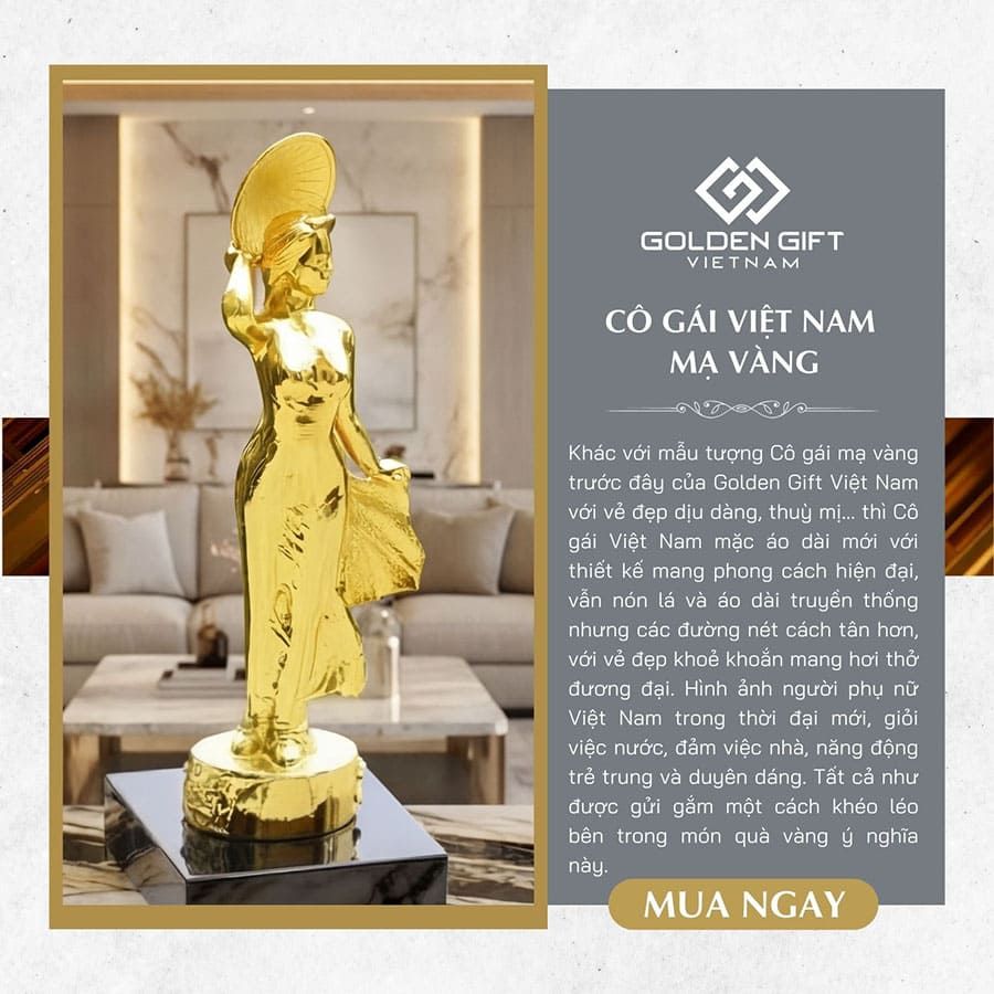 Tượng Cô gái mạ vàng do Golden Gift chế tác và mạ vàng thật bằng công nghệ điện phân. Hình ảnh Cô gái Việt Nam duyên dáng, mặc áo dài truyền thống, tay cầm nón lá, mang đến một vẻ đẹp thanh lịch và thuần khiết. Đây là món quà ý nghĩa tặng vợ, mẹ, người yêu, sếp nữ trong những dịp lễ Tết, cũng như tặng đối tác, chính khách người nước ngoài.