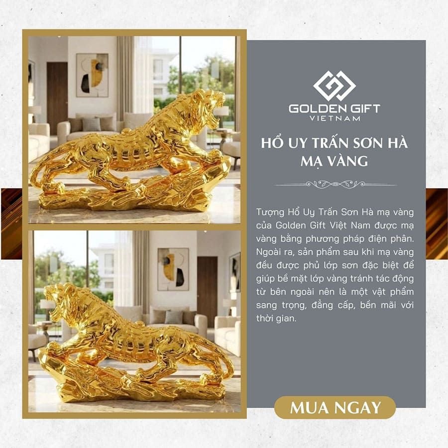 Cùng với sắc vàng quyền lực, lấp lánh, tượng hổ uy phong mạ vàng càng có tác dụng chiêu tài, mang lại may mắn với sự thăng tiến trong công việc, kinh doanh, là vật phẩm trưng bày phòng khách, phòng làm việc ấn tượng.