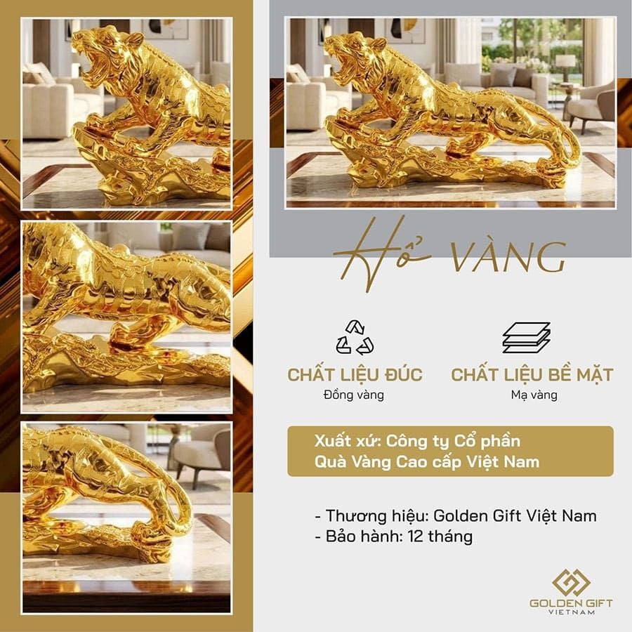 Tượng hổ uy trấn sơn hà mạ vàng do Golden Gift Việt Nam chế tác khắc họa sống động hình ảnh oai nghiêm, hùng dũng của "chúa tể sơn lâm". Hình ảnh chú hổ đang gầm lớn, rướn lên cao, đứng trên phiến đá với dáng vẻ uy phong, hùng cường tượng trưng cho người dẫn đầu lớn mạnh, xua tan hung khí, đón may mắn với những vận khí tốt lành.